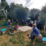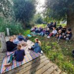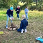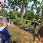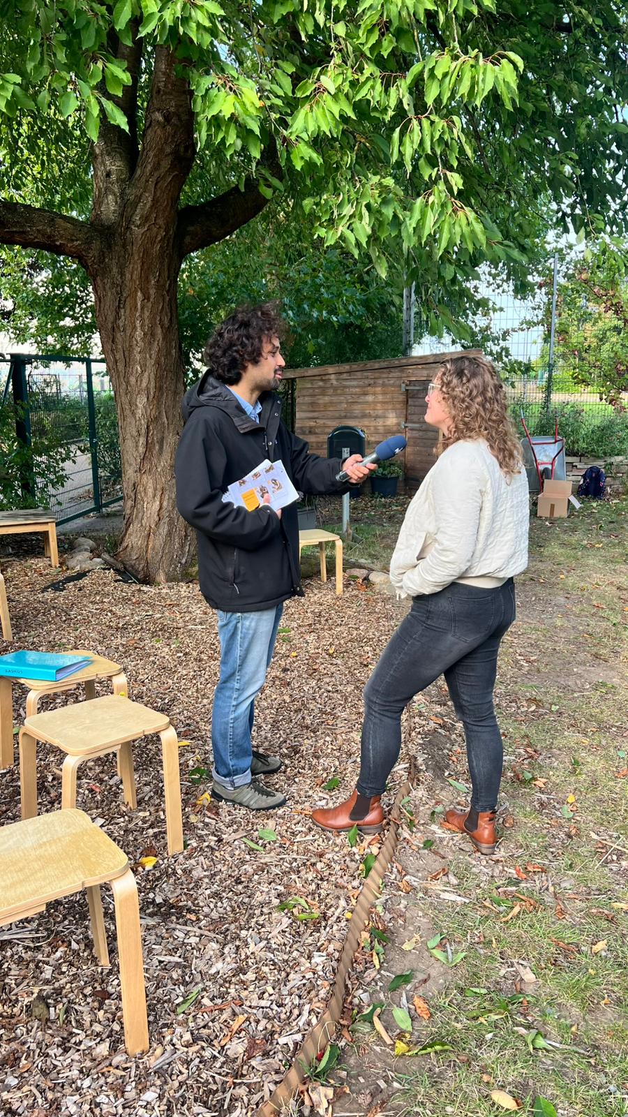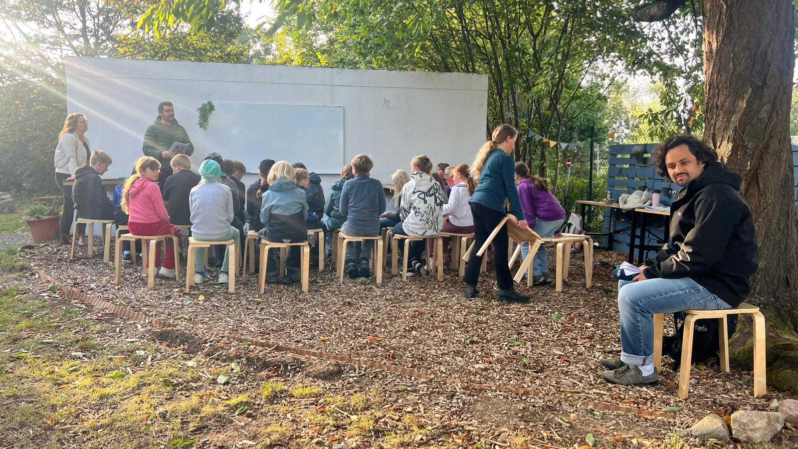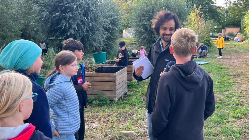 Am vergangenen Mittwoch, den 17.09.25, war es dann so weit: Gino Egbers vom NDR1 Niedersachen war zu Besuch in der Draußenklasse 5d. Bei gutem Wetter befassten sich die Kinder zunächst via Bildbeschreibung auf dem Hackholzplatz an der Tafel mit den Merkmalen der Altsteinzeit. Später nutzten sie das gesamte Schulgartengelände, um sich dort in Kleingruppen Rollenspiele zu diesem Thema auszudenken und den für sie perfekten Spielort zu suchen. Genutzt werden durfte wie immer alles, was sich im Schulgarten finden ließ, und so entstanden individuelle Theaterstücke mit kreativen Bühnenbildern. Gino Egbers lief mit den Kindern mit und hörte sich an, was ihnen an der Draußenklasse besonders gefällt und warum sie sich dafür entschieden haben. Der Beitrag wurde dann heute bei NDR1 ausgestrahlt, hier das Transkript des Beitrags, welches wir mit freundlicher Genehmigung veröffentlichen dürfen: