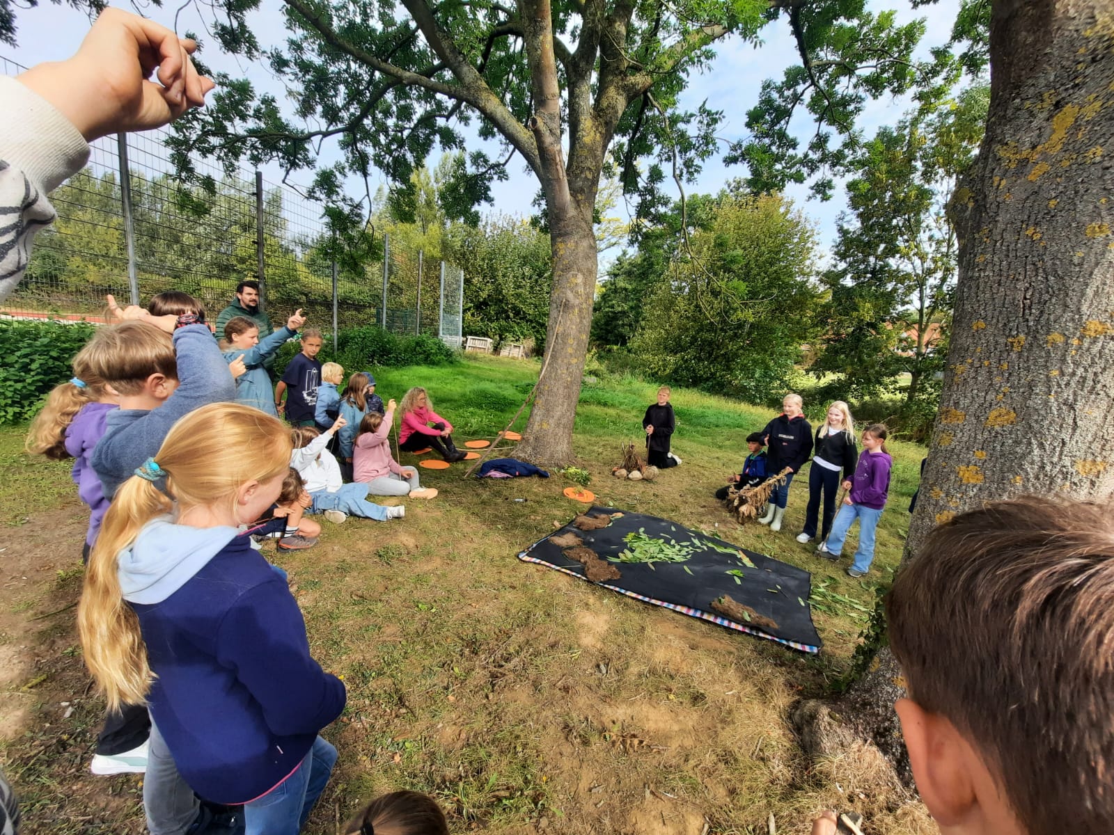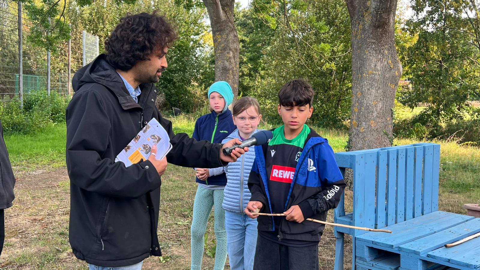 Lily Förster: „Es macht einfach viel mehr Spaß, wenn man draußen und in der Natur ist.“ Leo Raphael: „Drinnen schreibt man nur, und hier dürfen wir auch Sachen austesten.“ Emmy Bunjes: „Letztes Mal haben wir zum Beispiel Archäologische Funde im Sand ausgegraben, und das kann man halt im Klassenraum nicht machen.“