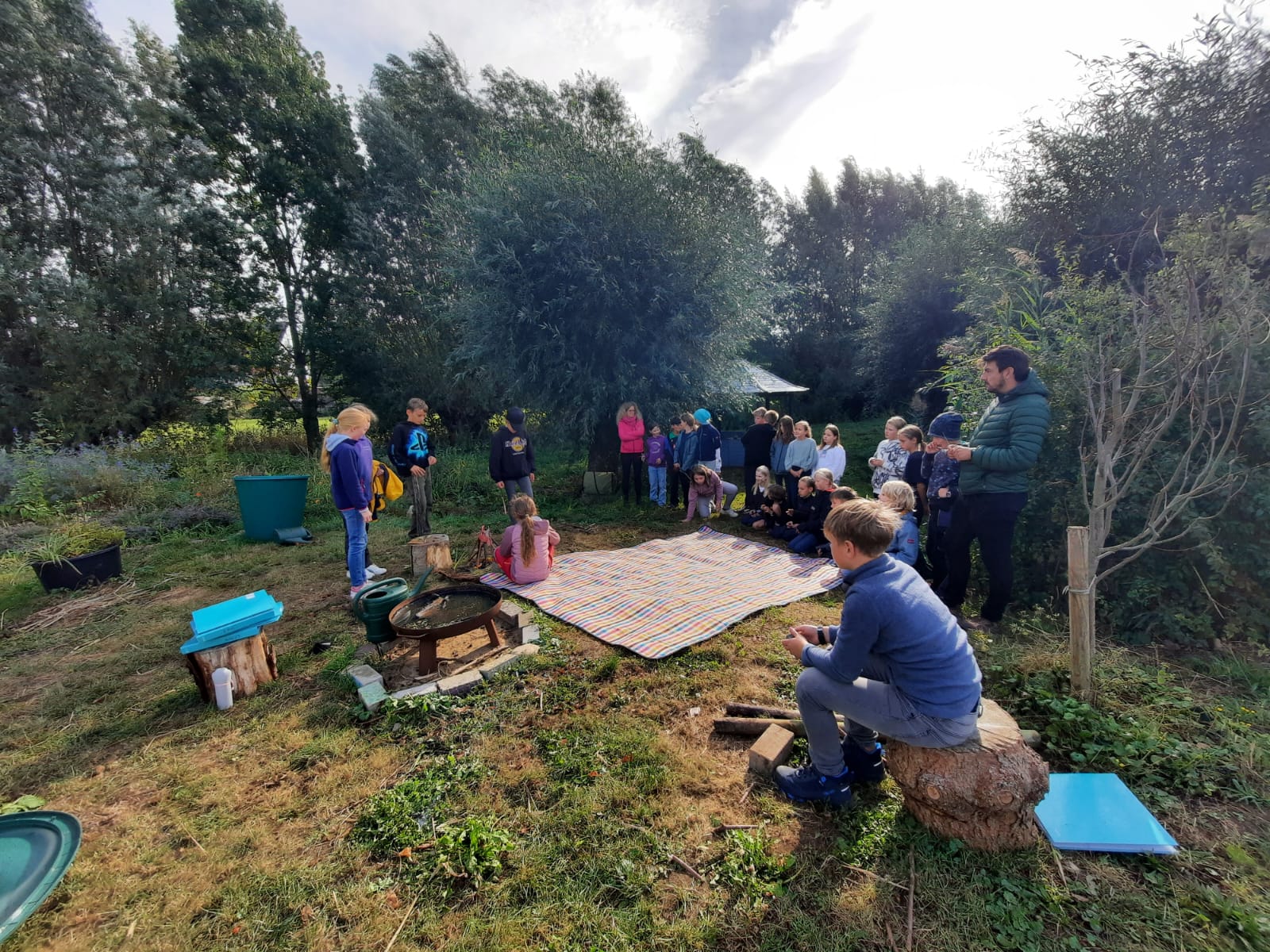 Bei 12 Grad und Wolken sitzen etwa 25 Kinder im Schulgarten der KGS Pattensen. Es gibt eine Tafel, Sitzhocker und Arbeitsblätter – Wände und Dach gibt es nicht. 15 Minuten arbeiten die Kinder heute am Platz und werden ins Thema Steinzeit eingeführt. Anschließend dürfen sie sich in Gruppen auf dem Schulgelände verteilen. Das Ziel: Sie sollen das Leben in der Steinzeit verstehen.
