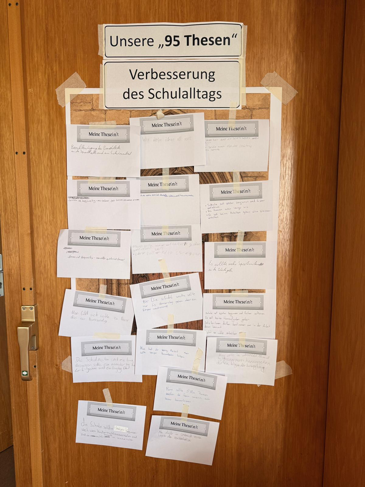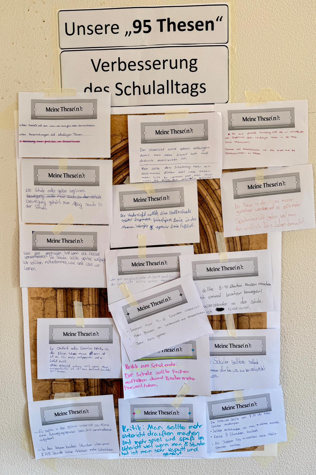 Als drittes waren wir bei der Station von Frau Windorf. Bei dieser Station haben wir über die 95 Thesen geredet und viel darüber erfahren. Am Ende haben wir selbst Thesen zum Thema Schule geschrieben, wie es damals Martin Luther über die Kirche gemacht hat. Da durften wir sehr kreativ werden und hatten viele Ideen.