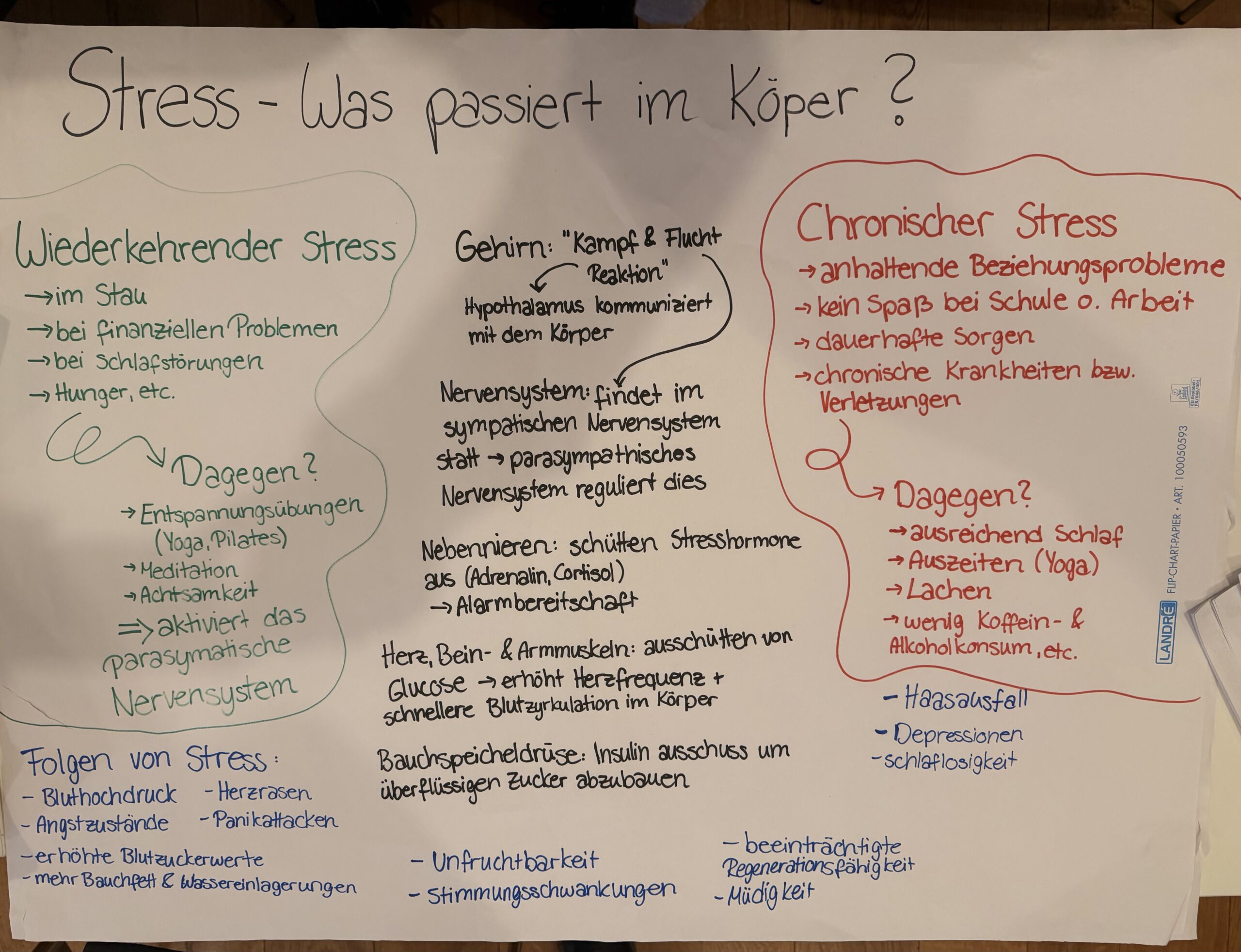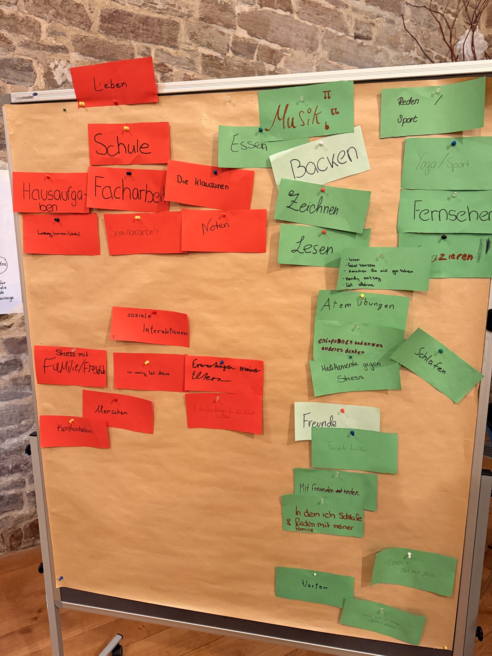 Im Verlauf der Woche beschäftigten wir uns intensiver mit den Ursachen von Stress. Dabei ordneten wir persönliche Probleme und Stressfaktoren, um besser zu verstehen, was uns im Alltag belastet. Ergänzend dazu lernten wir, was Stress eigentlich ist, wie er entsteht und welche Auswirkungen er auf uns physisch und psychisch hat. Dieses Wissen machte deutlich, wie wichtig ein bewusster Umgang mit Stress ist.