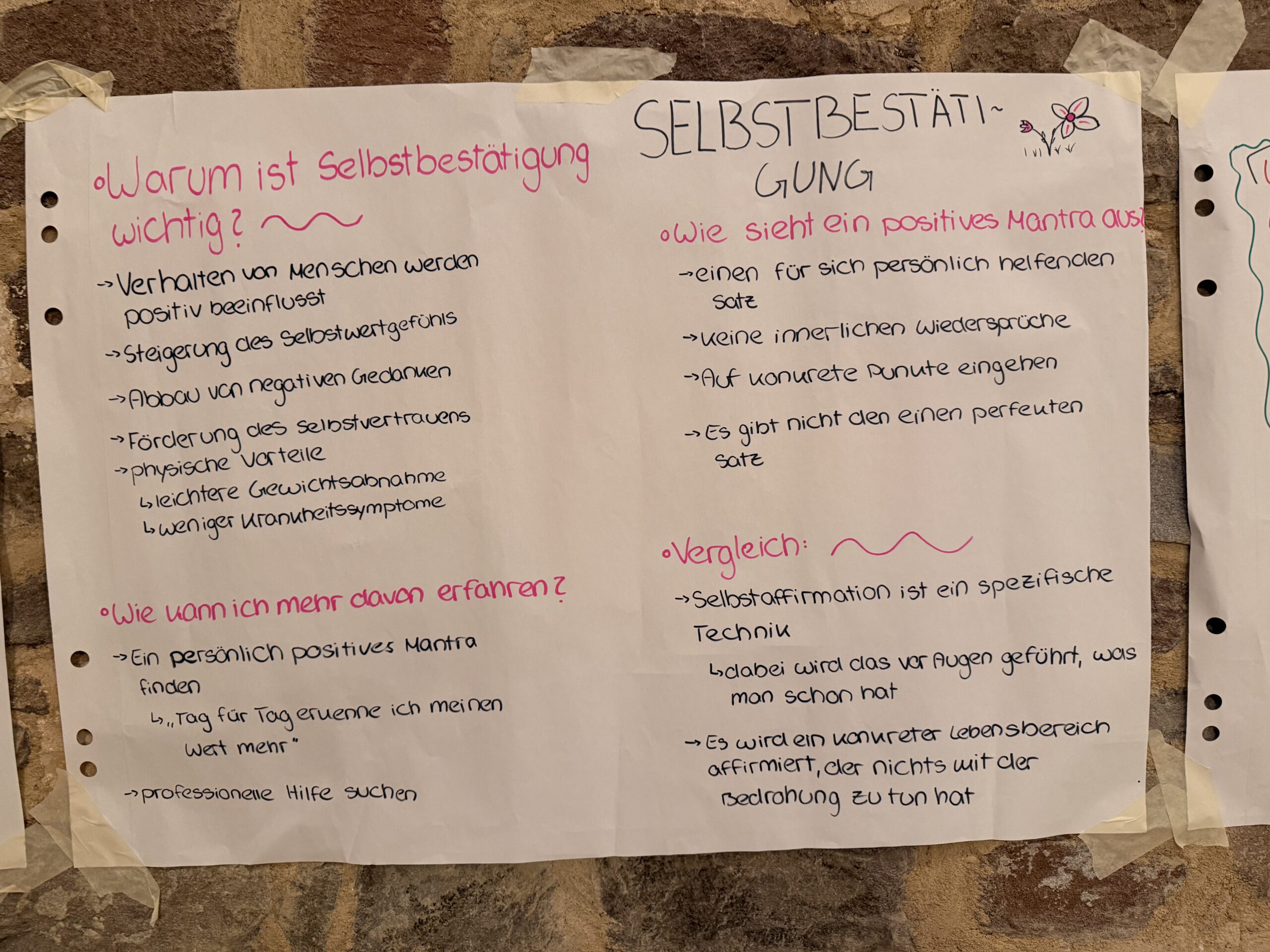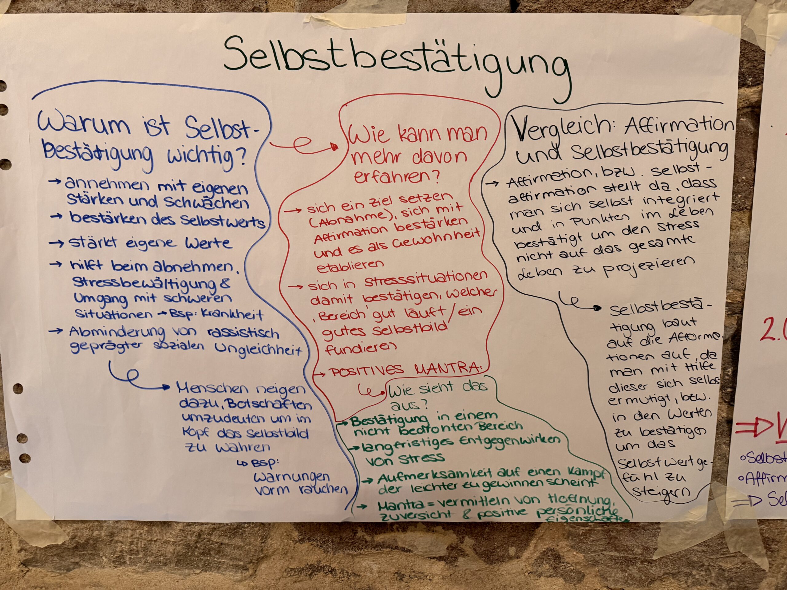 Außerdem haben wir uns mit unseren eigenen Stärken beschäftigt und uns gegenseitig positives Feedback gegeben, was für uns eine sehr wertvolle Erfahrung war. Besonders das Gestalten der Visionboards ist im Gedächtnis geblieben, da wir dort unsere Wünsche, Ziele und Werte festhalten konnten. Dadurch wurden wir dazu angeregt bewusster über die Zukunft nachzudenken und haben neue Motivation aus dieser Woche gewonnen.
