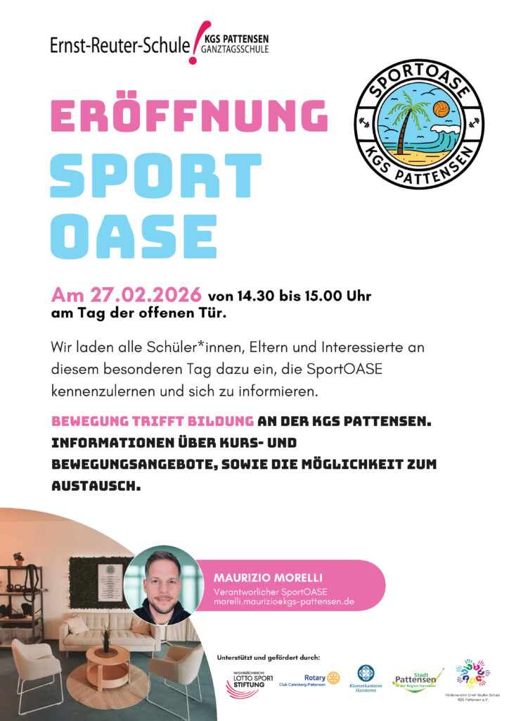 Im Rahmen des Tages der Offenen Tür bzw. unmittelbar davor findet am Freitag, den 27.02.26 die Eröffnung unserer SportOASE statt. Alle Informationen hierzu sind dem u. a. Plakat zu entnehmen.