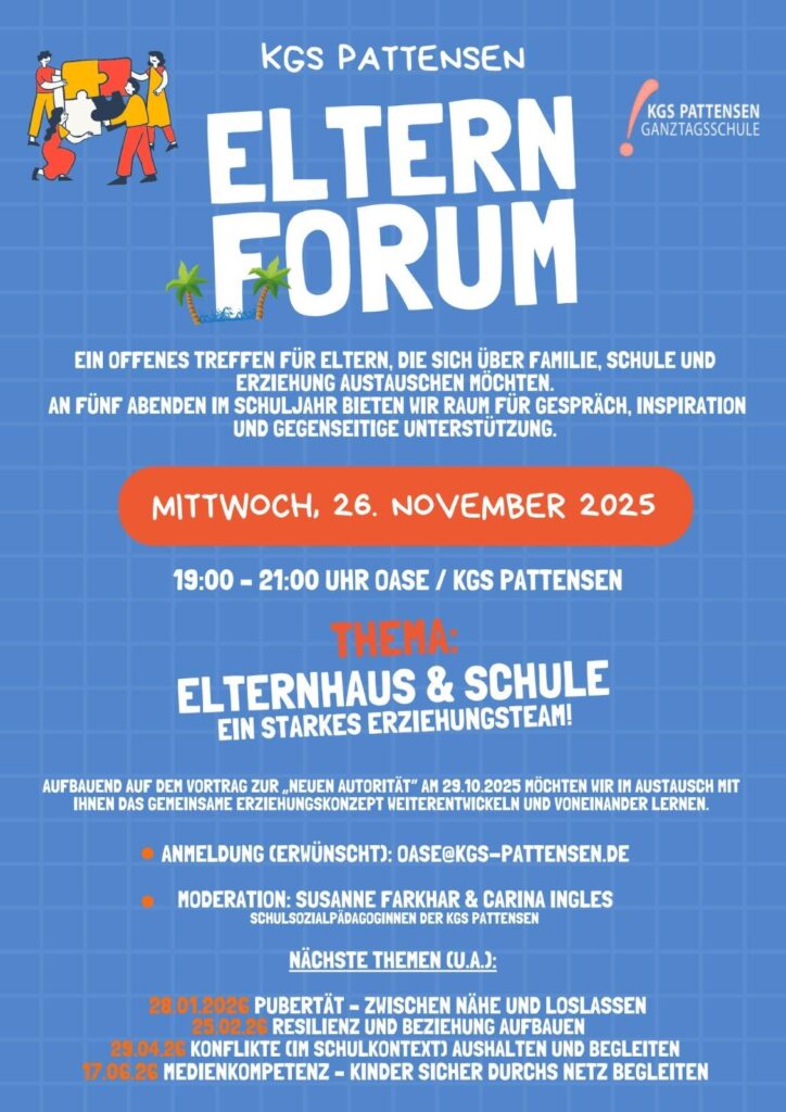 Liebe Eltern, auch in diesem Schuljahr laden wir Sie herzlich zum Elternforum der KGS Pattensen ein – einem offenen Austausch für alle Eltern, die sich zu Themen rund um Familie, Schule und Erziehung austauschen möchten. Der erste Termin findet am📅 Mittwoch, den 26. November 2025,🕖 von 19:00 bis 21:00 Uhr📍 in der Oase der KGS […]